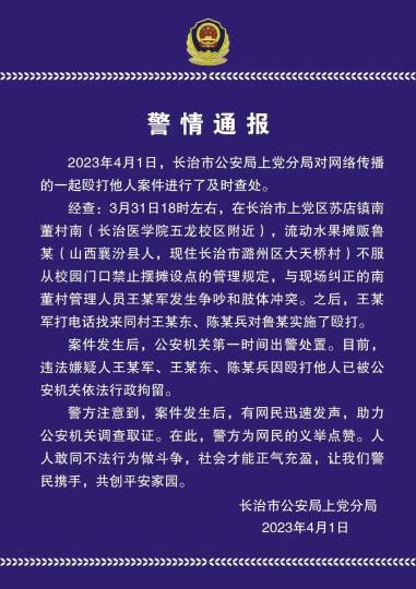 经查:3月31日18时左右,在长治市上党区苏店镇南董村南(长治医学院五龙校区附近),流动水果摊贩鲁某(山西襄汾县人,现住长治市潞州区大天桥村)不服从校园门口禁止摆摊设点的管理规定,与现场纠正的南董村管理人员王某军发生争吵和肢体冲突。之后,王某军打电话找来同村王某东、陈某兵对鲁某实施了殴打。