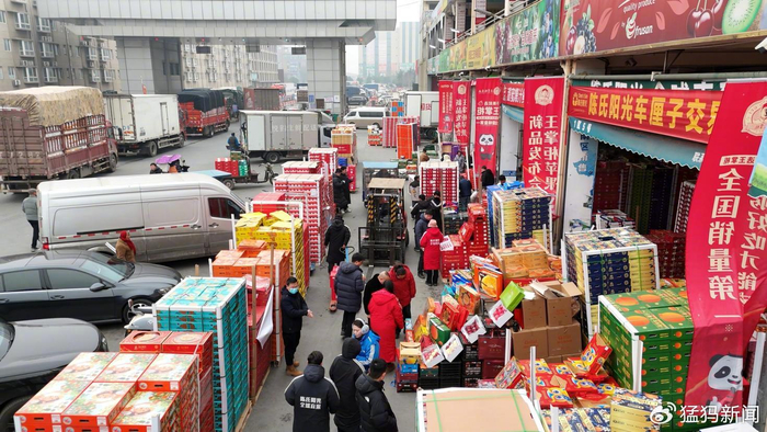 在郑州陈氏阳光果蔬贸易有限公司(以下简称:陈氏阳光)的水果批发档口,记者看到几十个档口门前都停满了全国各地牌照的采购车辆,档口人头攒动,来自天南地北的口音在这里碰撞,配货叉车、货运三轮车在不停穿梭,各种各样的水果礼盒堆积如山、整齐列队,正等待着被发往千家万户。
